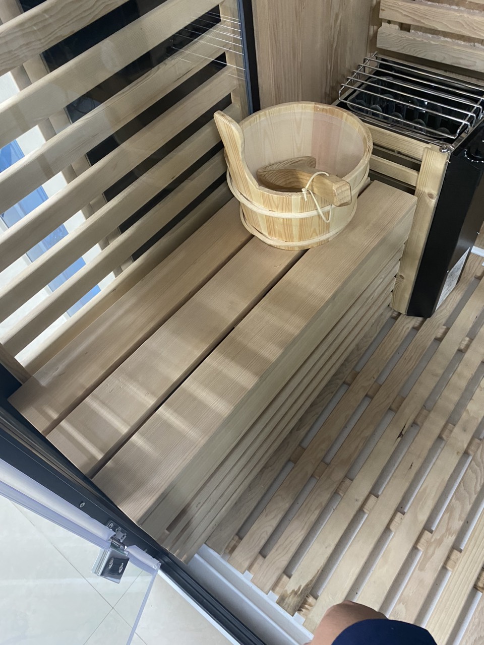 - Phòng xông hơi khô được thiết kế theo phong cách truyền thống, kín đáo. Toàn bộ khu vực xông hơi khô gồm trần, vách, sàn, băng ghế đến chậu đựng nước và gáo múc nước được làm từ gỗ cao cấp, chống giữ nhiệt tránh gây bỏng trong khi sử dụng.