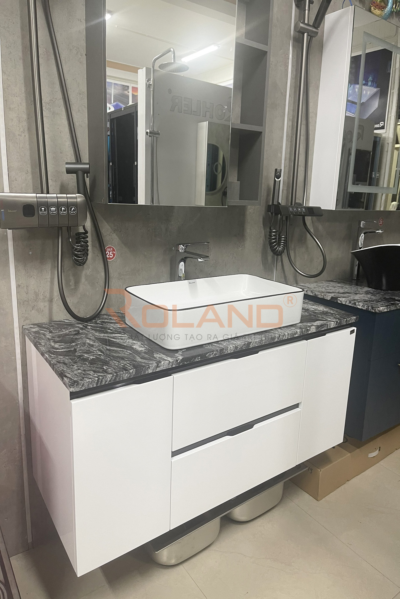 Với sự kết hợp 4 trong 1 giữa tủ đựng đồ, chậu rửa, mặt đá và gương tạo nên Tủ Lavabo nhựa PVC Roland LB 103 vừa tiện dụng vừa tiết kiệm diện tích mà còn tăng tính thẩm mỹ cho căn phòng. Bộ tủ lavabo ROLAND là sự lựa chọn lý tưởng cho không gian phòng tắm cho gia đình bạn